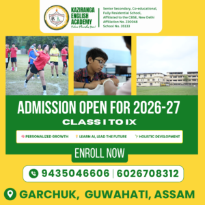 Kaziranga English Academy is nestled in the cozy lap of lush green Nature, amidst the verdant hills, in the southern fringe of Guwahati – the gateway to the North-East. It has a sprawling school campus of more than five acres of land against a spectacular backdrop of misty hills; appropriately located away from the hustle and bustle of the city.